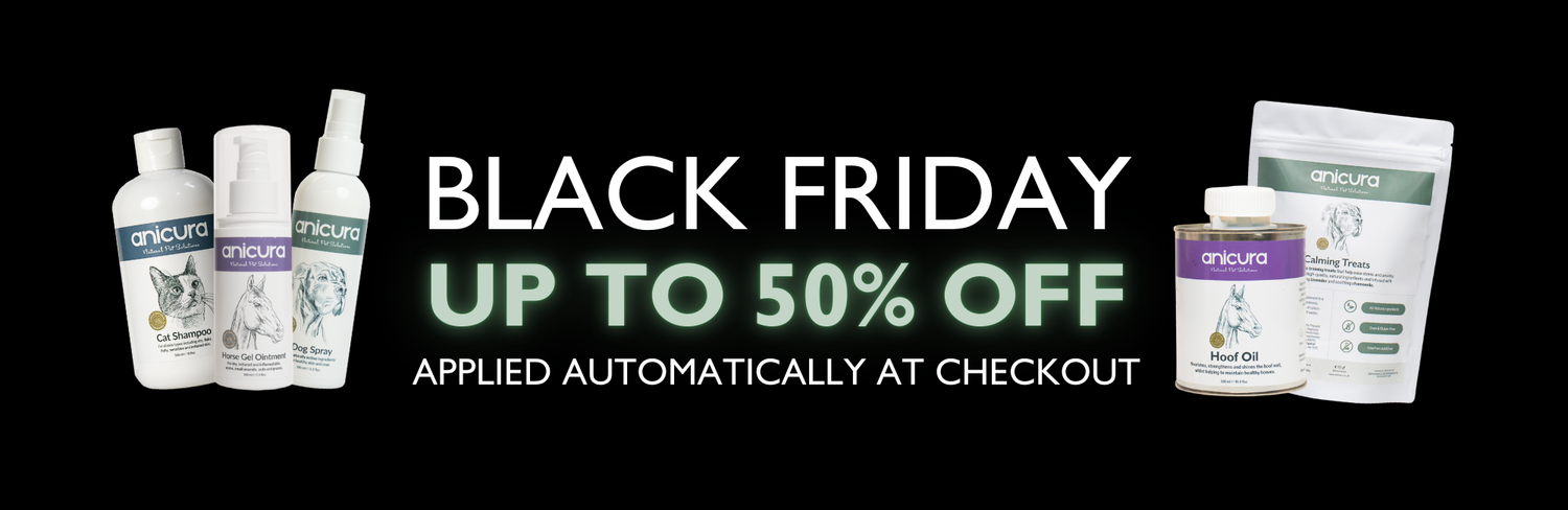 Offer ends 23:59, 1/12/25. Automatically applied at checkout. Cannot be used with any other discounts, bundles or subscribe and save. 50% off applies to Hoof Oil, Hoof Clay, Anti Itch Chews, Ear Cleaners, 1l Shampoo & 500ml Spray. 25% off 300ml Shampoo, Gel, 100ml Spray, Treats and Tote Bag.